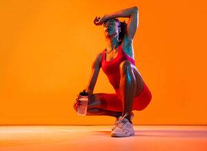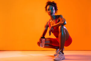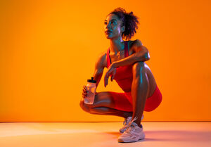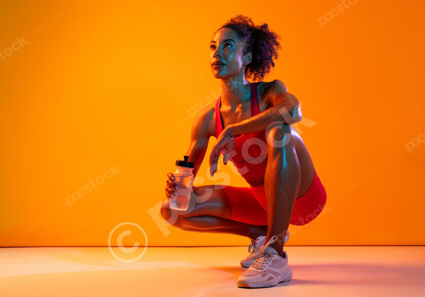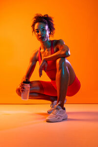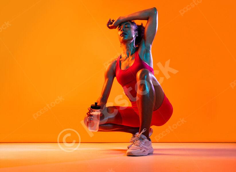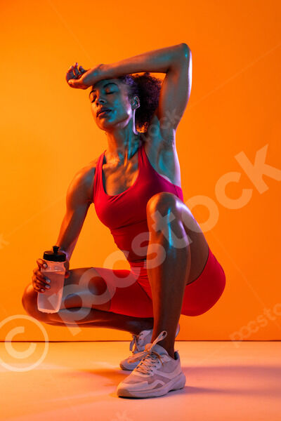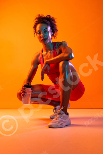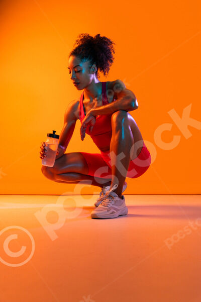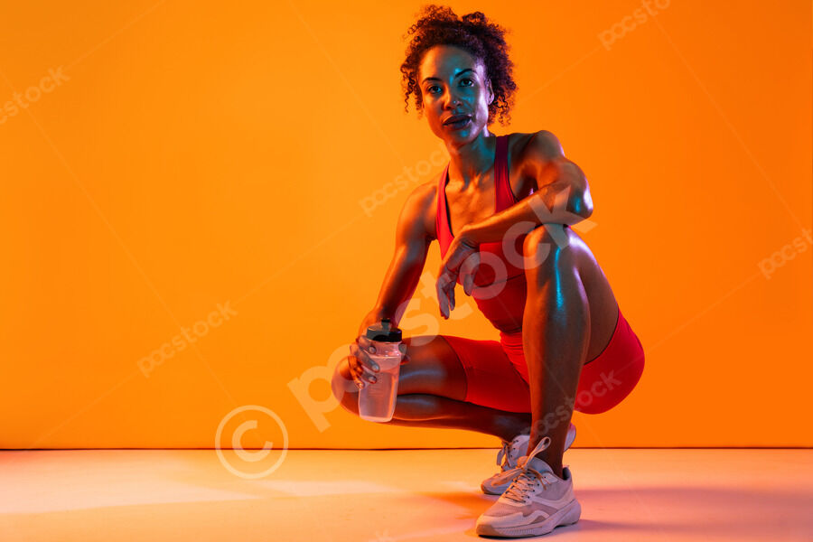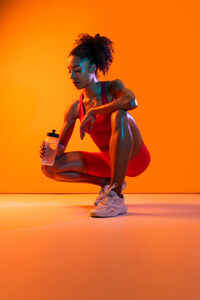 Muscular Hispanic woman in fitness wear holding water bottle crouching over orange background in studio
