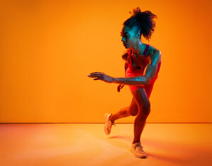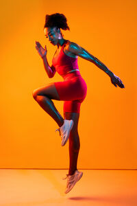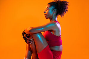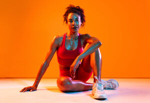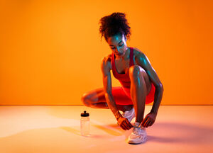 Muscular Hispanic woman in fitness wear tying her shoelace crouching over orange background in studio