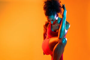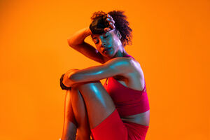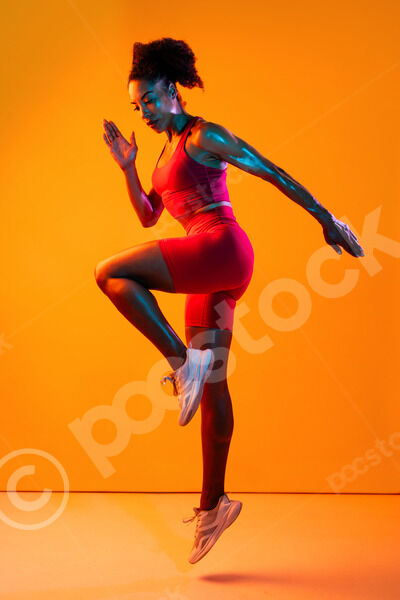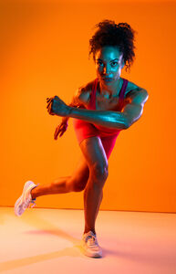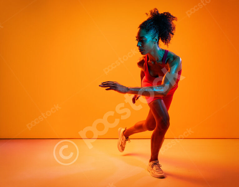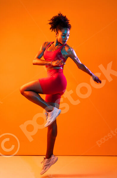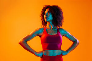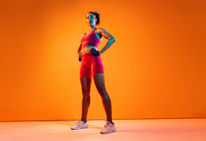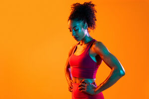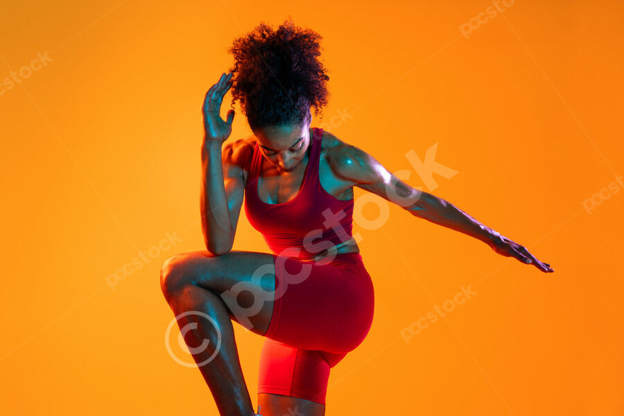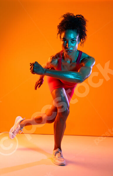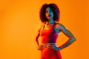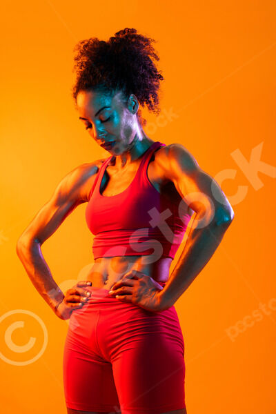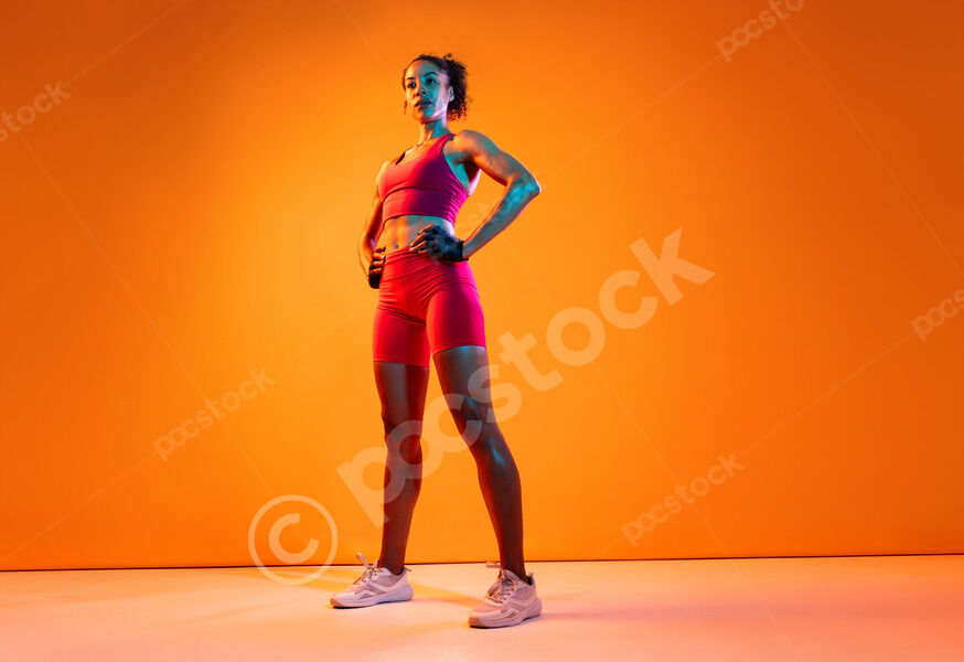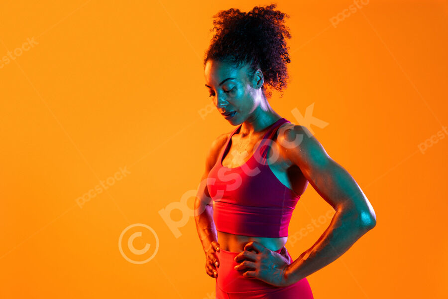 Muscular Hispanic woman in fitness wear looking down standing with hands on waist against orange background in studio