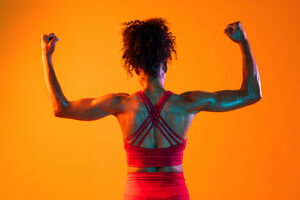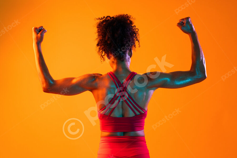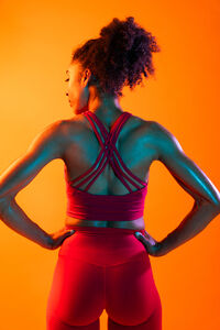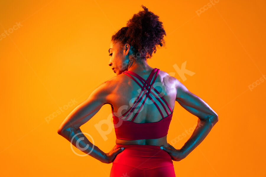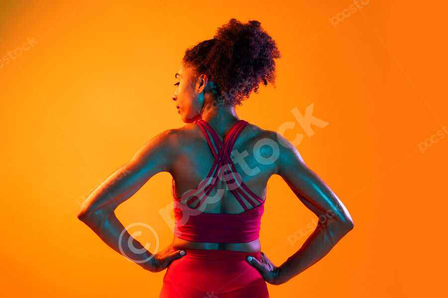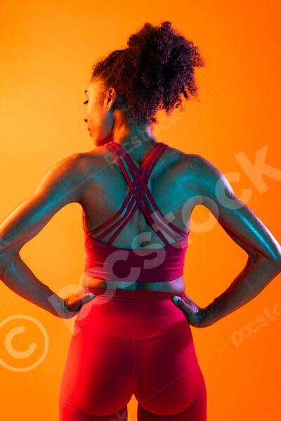 Back view of muscular Hispanic woman in fitness wear looking sideways standing with hands on her waist against orange background in studio