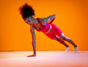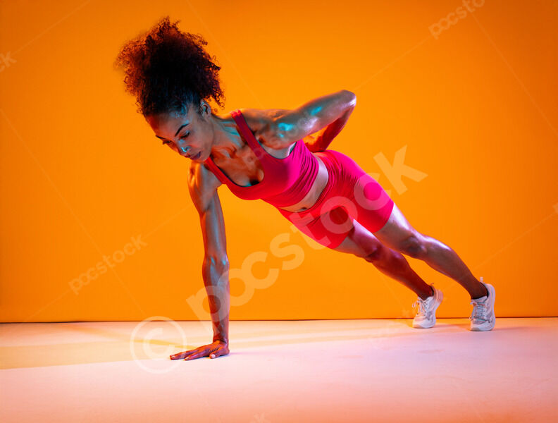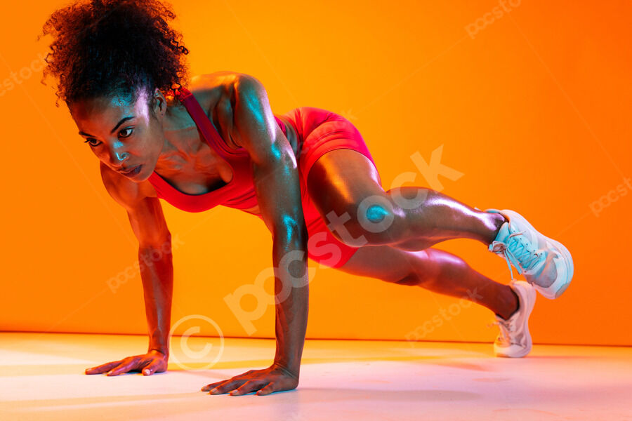 Muscular Hispanic woman in fitness wear doing push-up with leg raise against orange background in studio