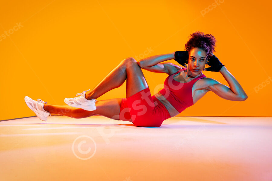 Muscular Hispanic woman in fitness wear and workout gloves sitting on floor and doing stretching exercises over orange background in studio
