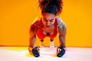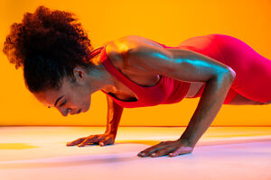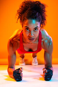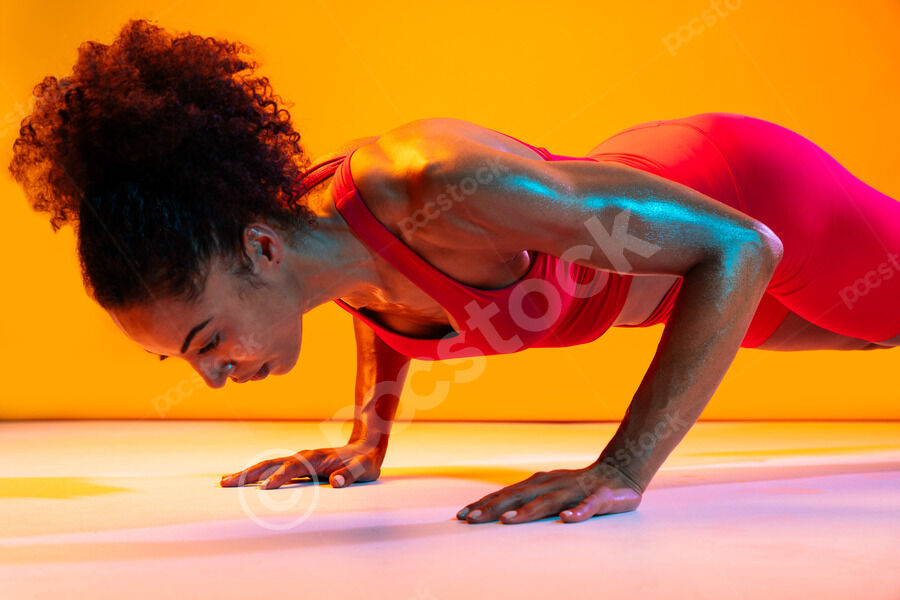 Muscular Hispanic woman in fitness wear doing push-up exercises over orange background in studio