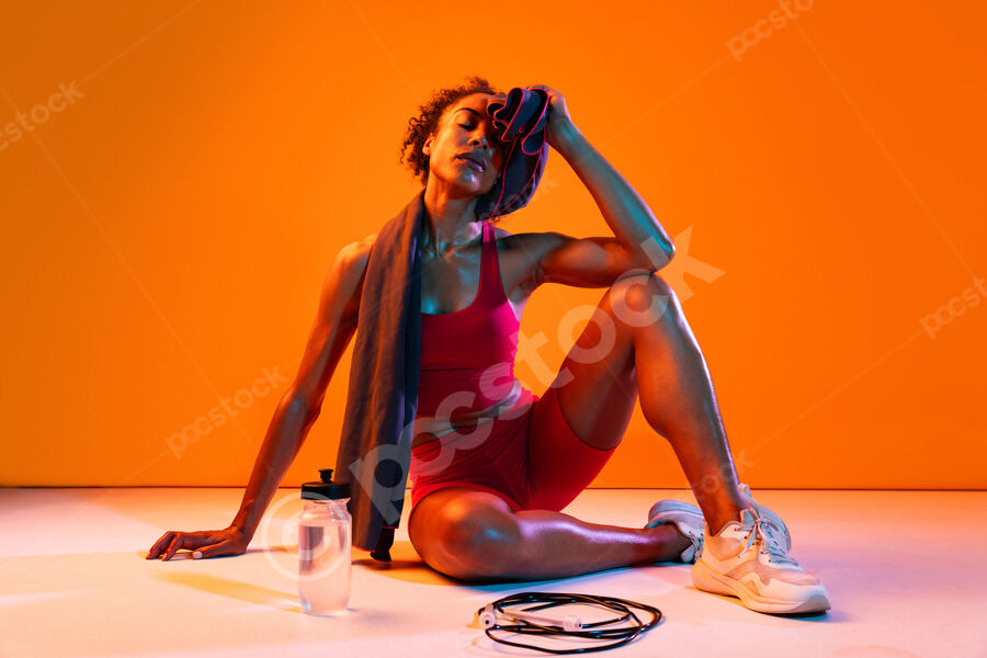 Muscular Hispanic woman in fitness wear wiping sweat on her forehead using towel sitting on floor with water bottle and jumping rope over orange background in studio