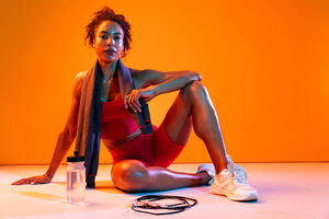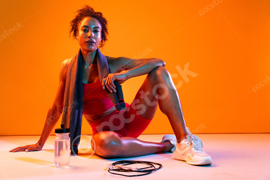 Muscular Hispanic woman in fitness wear and towel around her neck sitting on floor with water bottle and jumping rope over orange background in studio