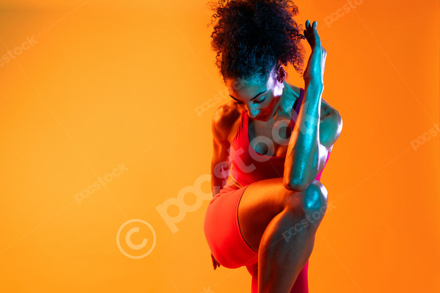 Muscular Hispanic woman in fitness wear doing stretching exercises over orange background in studio