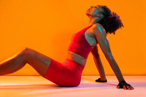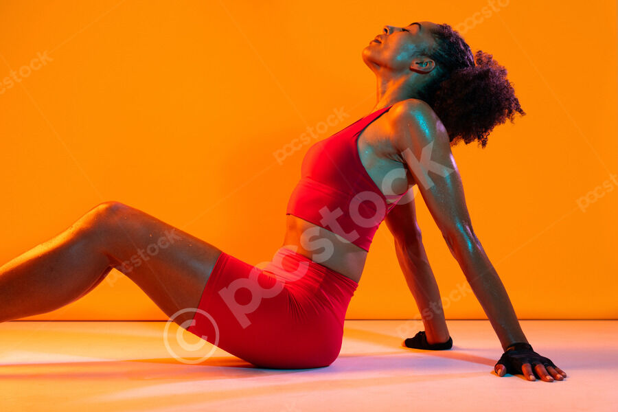 Muscular Hispanic woman in fitness wear and workout gloves leaning back on her hands sitting with closed eyes on floor over orange background in studio