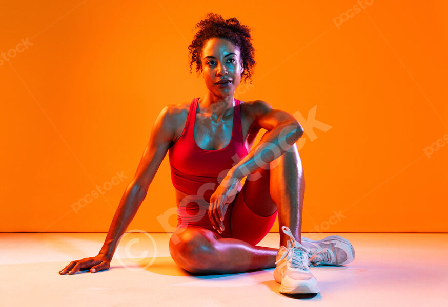 Muscular Hispanic woman in fitness wear leaning her arm on her knee while sitting on floor over orange background in studio