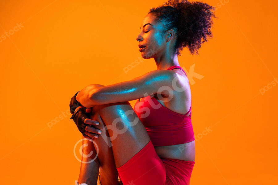 Muscular Hispanic woman in fitness wear and workout gloves sitting with closed eyes and hugging her legs over orange background in studio