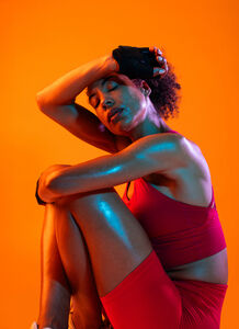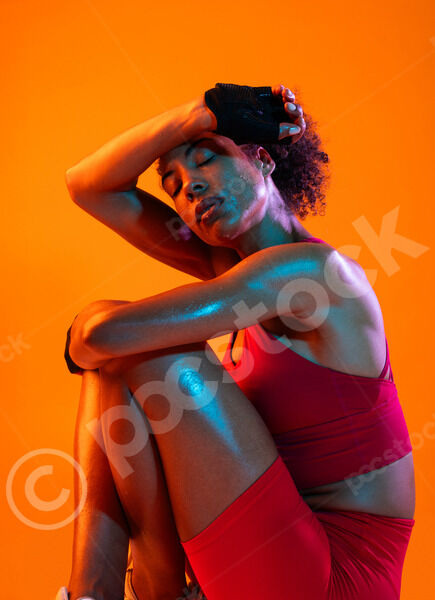 Muscular Hispanic woman in fitness wear and workout gloves wiping her sweat on her forehead while sitting with closed eyes and hugging her legs against orange background in studio