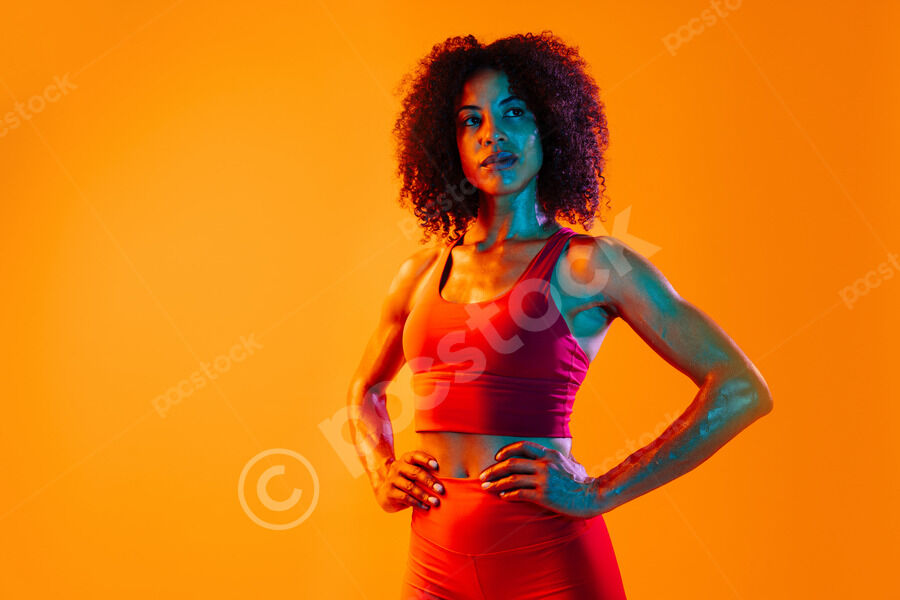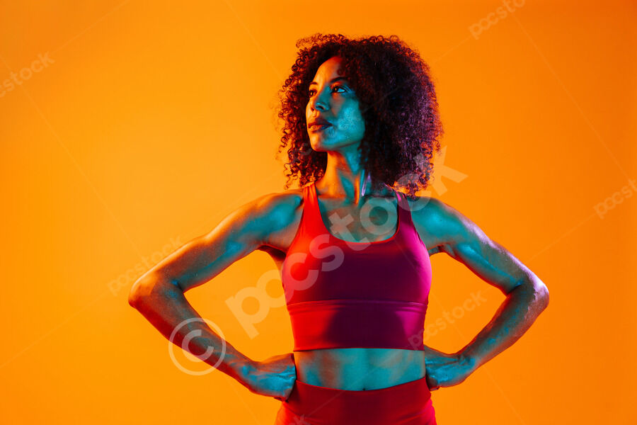 Muscular Hispanic woman in fitness wear looking away standing with hands on waist against orange background in studio