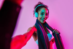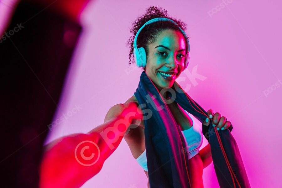 Muscular Hispanic woman in white fitness wear, towel around her neck, and headphones taking selfie while standing against pink background in studio