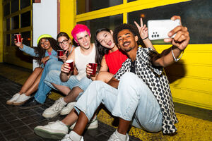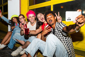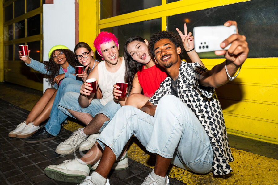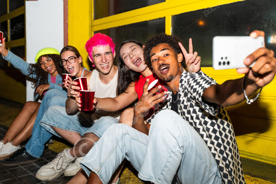 Diverse group of friends holding red cups with alcohol taking selfie on smartphone while sitting together in front of yellow window on street at night
