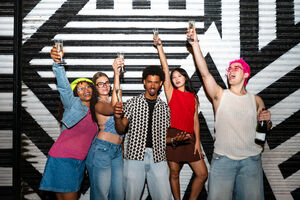 Diverse group of friends raising glasses with cocktails while standing together in front of black and white metal shutter on street at night