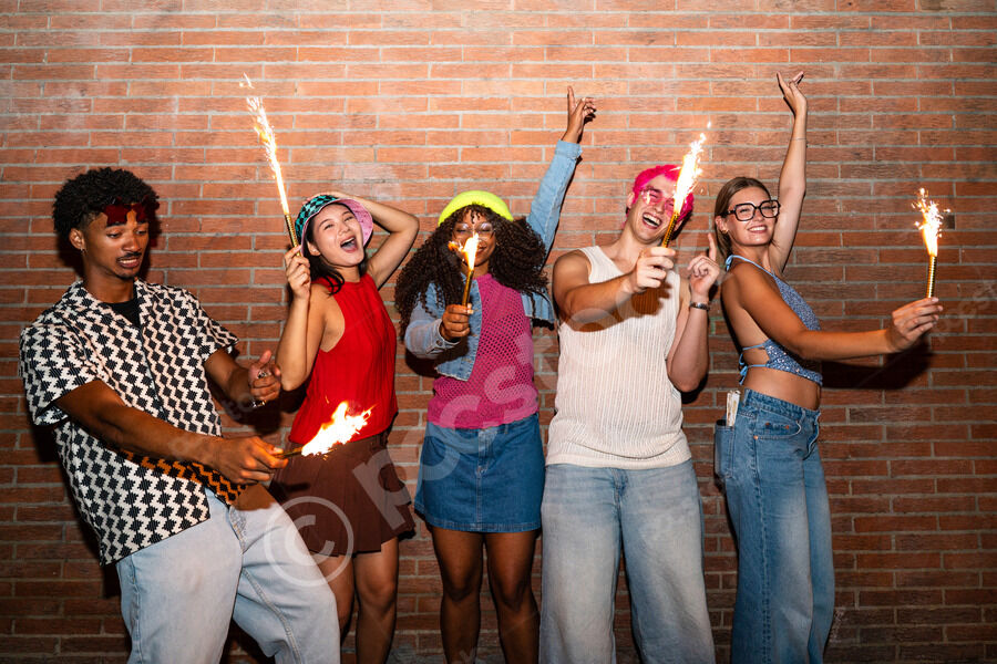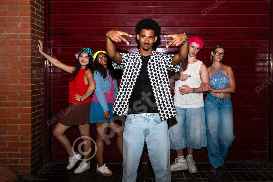 Hispanic man showing peace signs standing in front of his diverse friends against brown wall on street at night