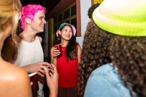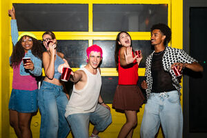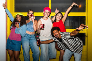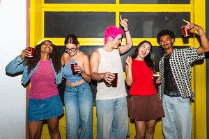 Diverse group of friends holding red cups and laughing while standing with arms around each other in disco club at night