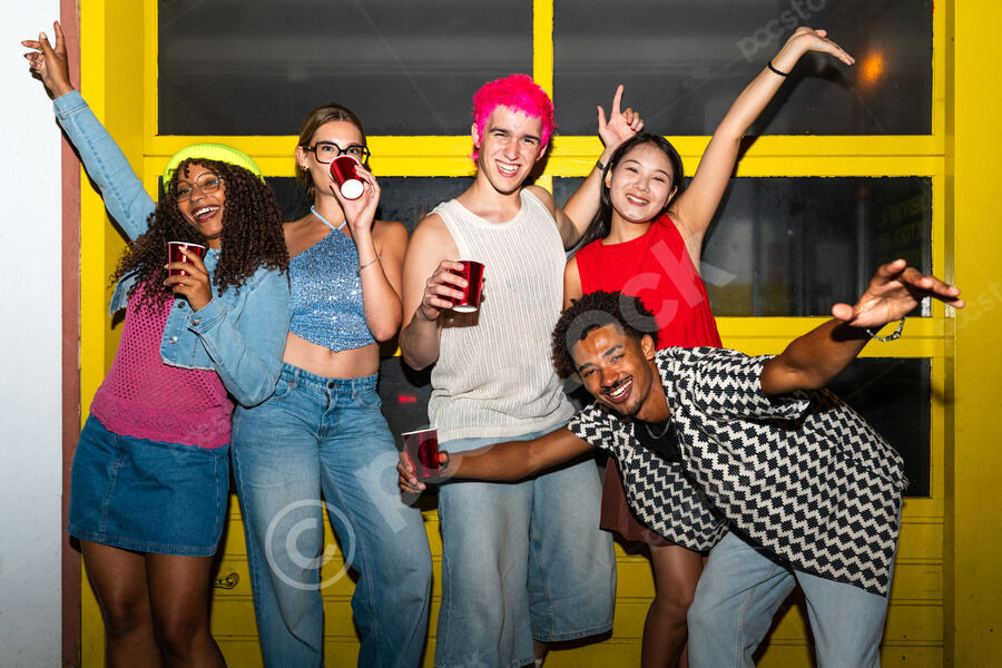 Diverse group of friends having fun raising their arms holding red cups while standing in disco club at night