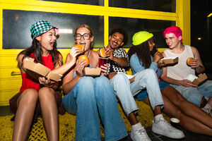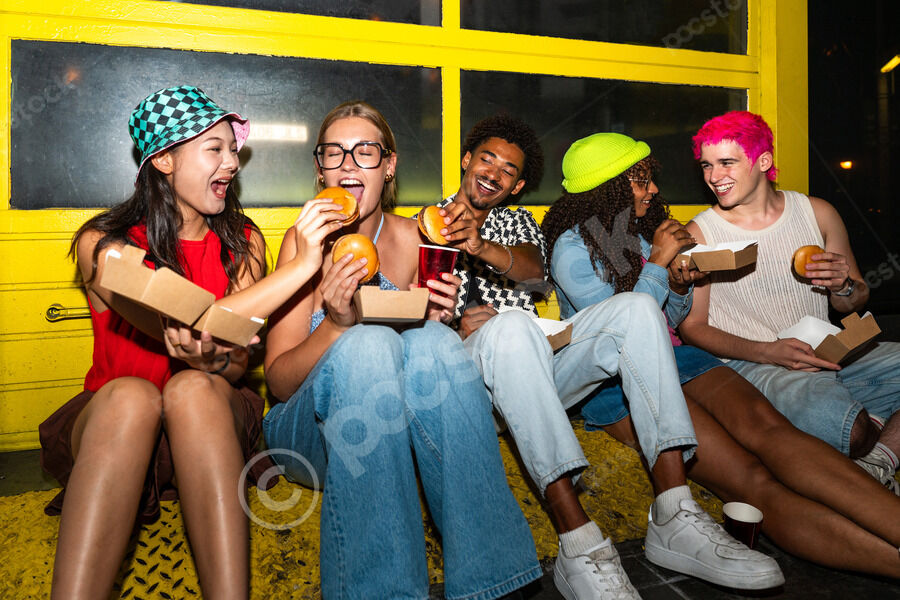 Diverse group of friends having fun eating burgers while sitting together on yellow metal bench and wall on street at night