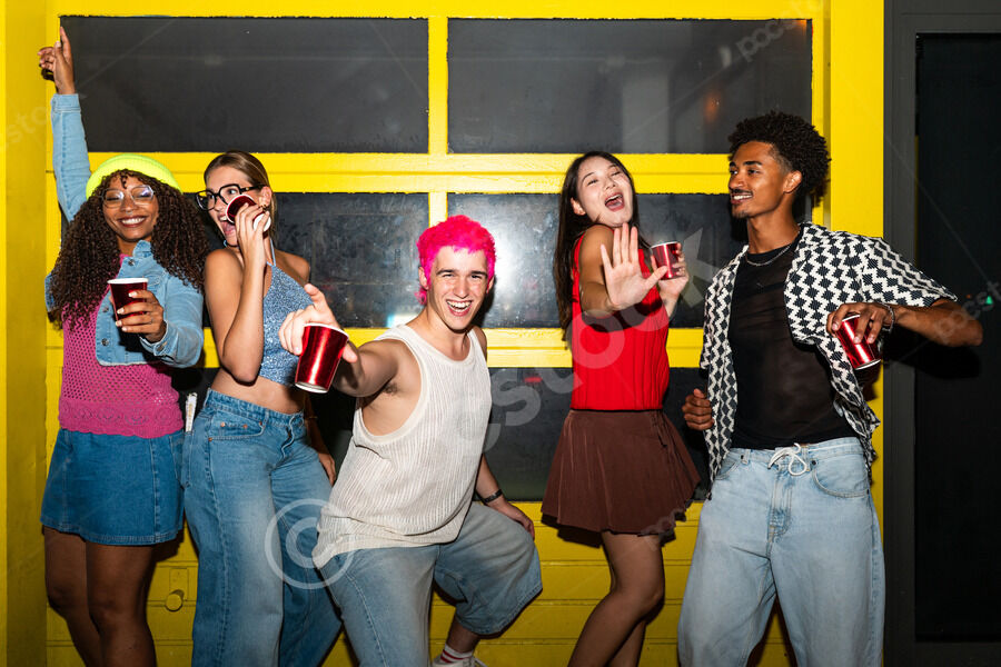 Diverse group of friends having fun holding red cups and drinking alcohol while standing together in disco club at night