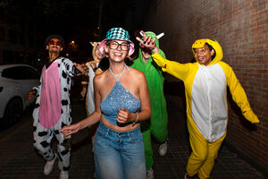 Diverse group of friends wearing onesie costumes having fun running together on street at night