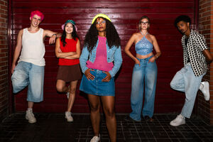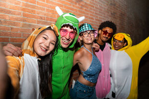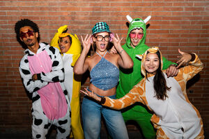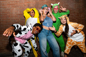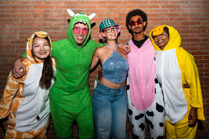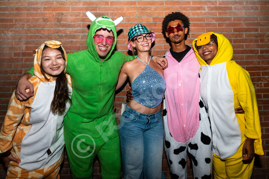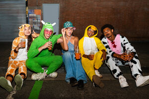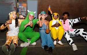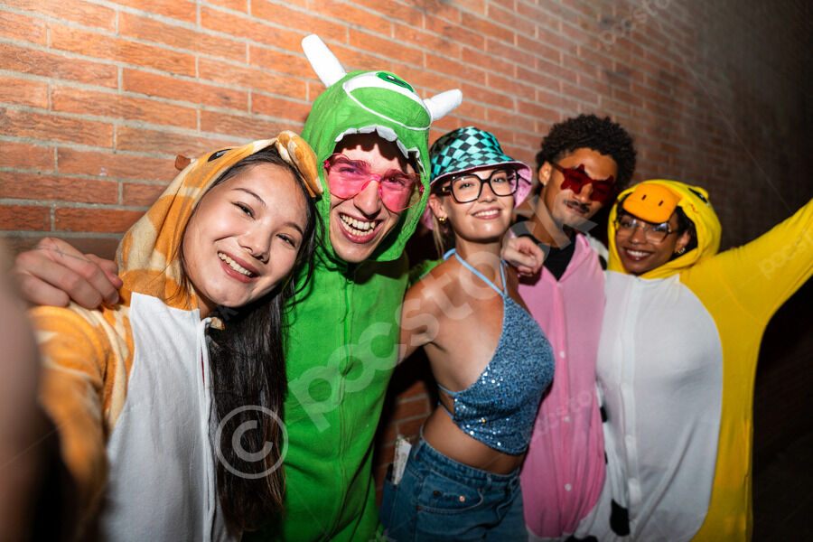 Diverse group of friends wearing onesie costumes having fun standing with arms around each other in front of brick wall on street at night