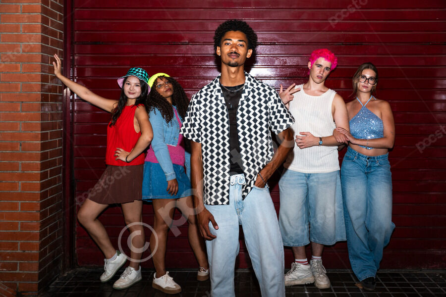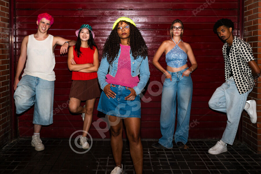 Diverse group of friends having fun while standing together in front brown wall on street at night