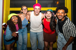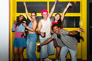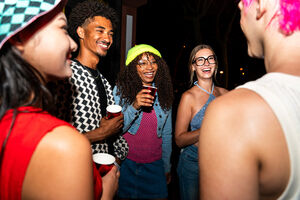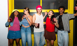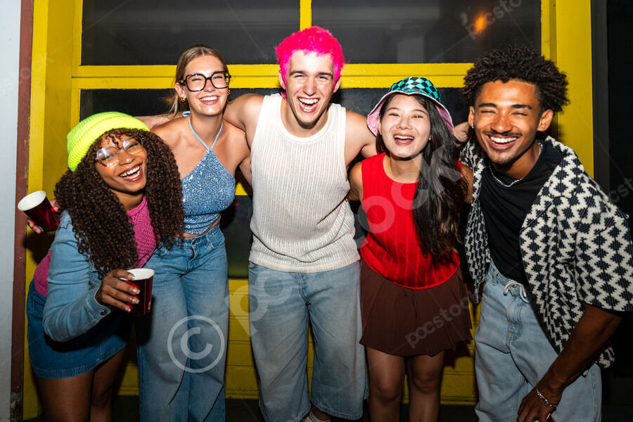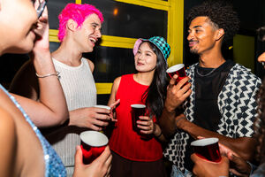 Diverse group of friends holding red cups and laughing while standing with arms around each other in disco club at night