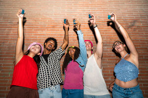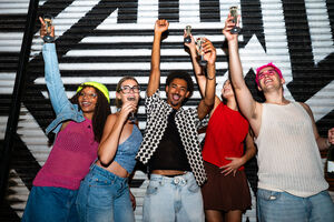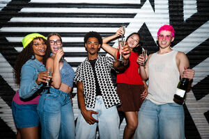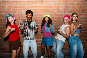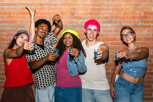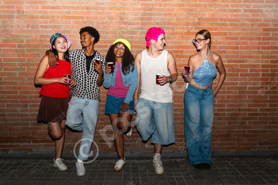 Diverse group of friends holding red cups with cocktails while standing together against brick wall