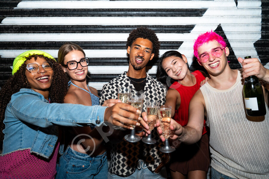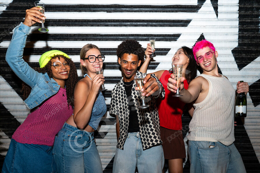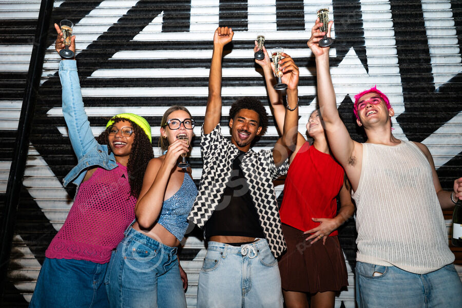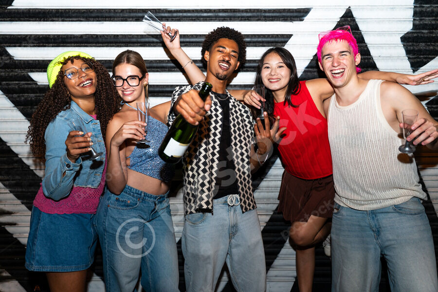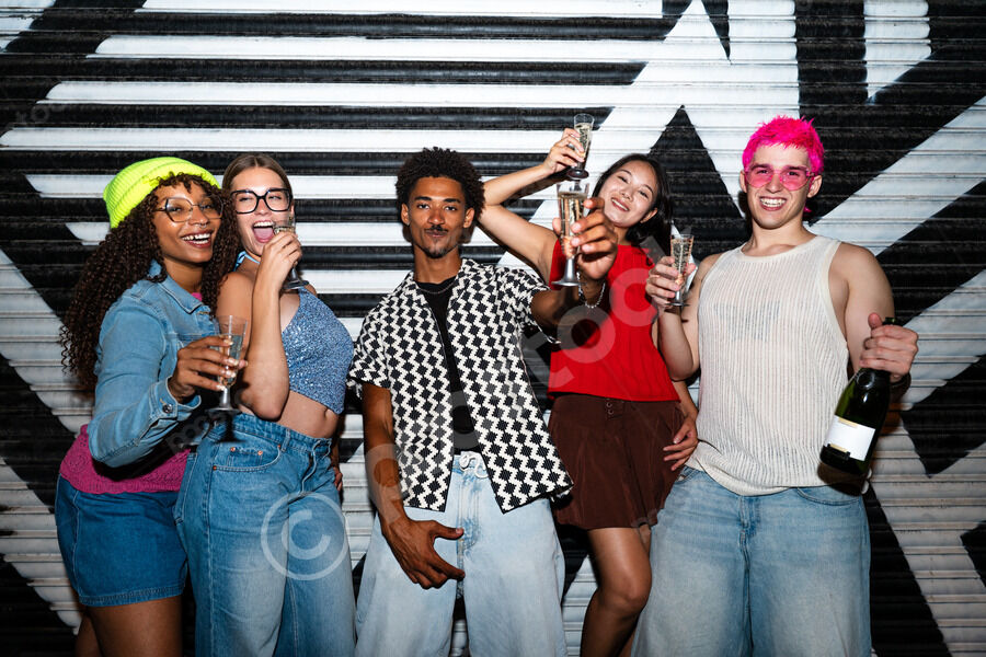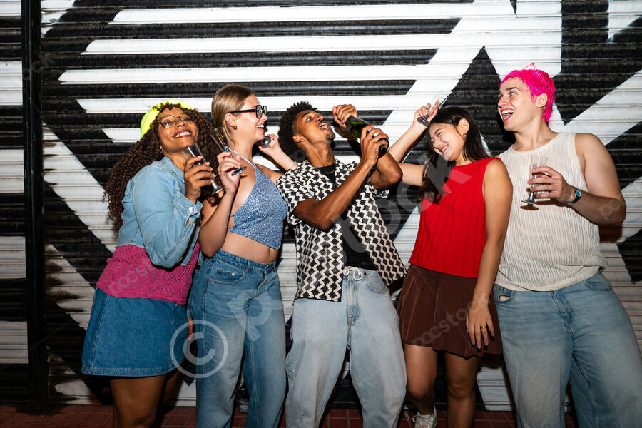 Diverse group of friends having fun drinking champagne while standing together in front of black and white metal shutter on street at night