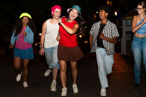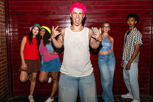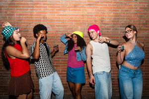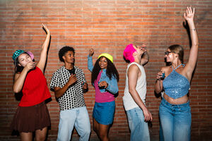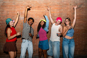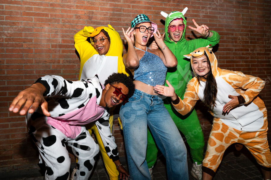 Diverse group of friends wearing onesie costumes having fun dancing in front of brick wall on street at night