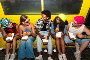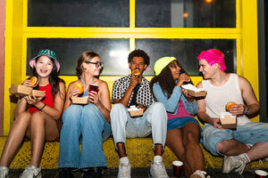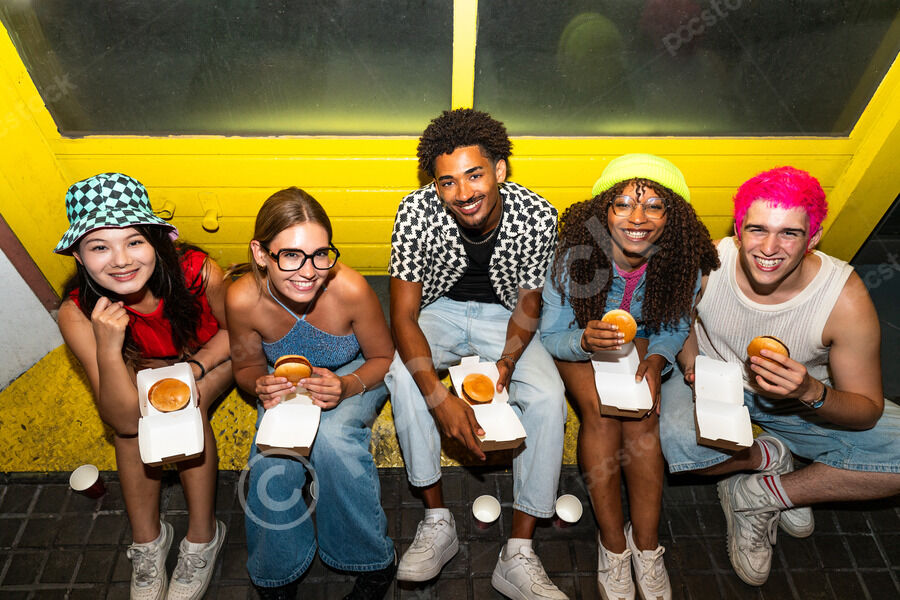Diverse group of friends having fun eating burgers while sitting together on yellow metal bench and wall on street at night