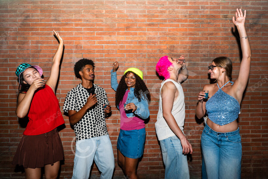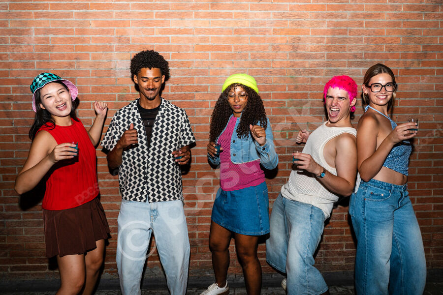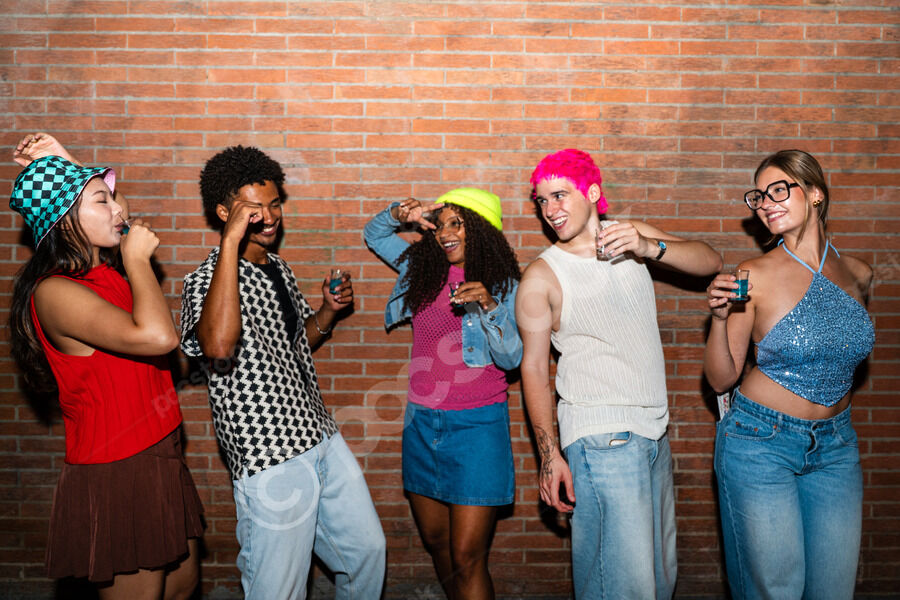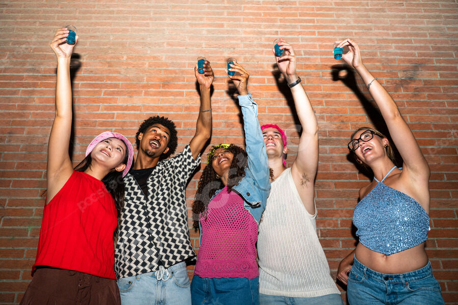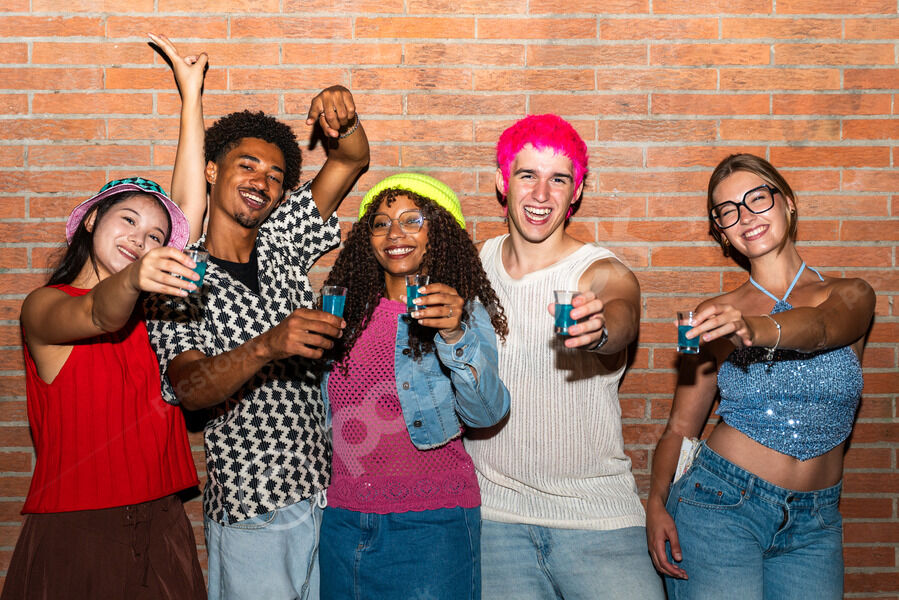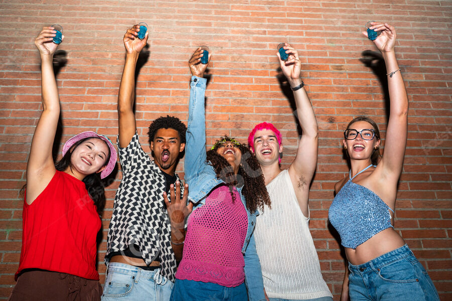 Diverse group of friends having fun holding shot glasses with blue liquor dancing together in front of brick wall in disco club at night
