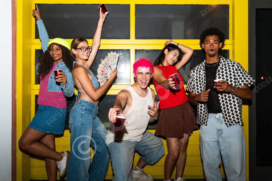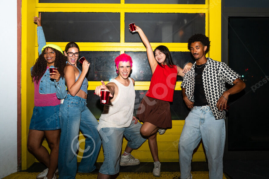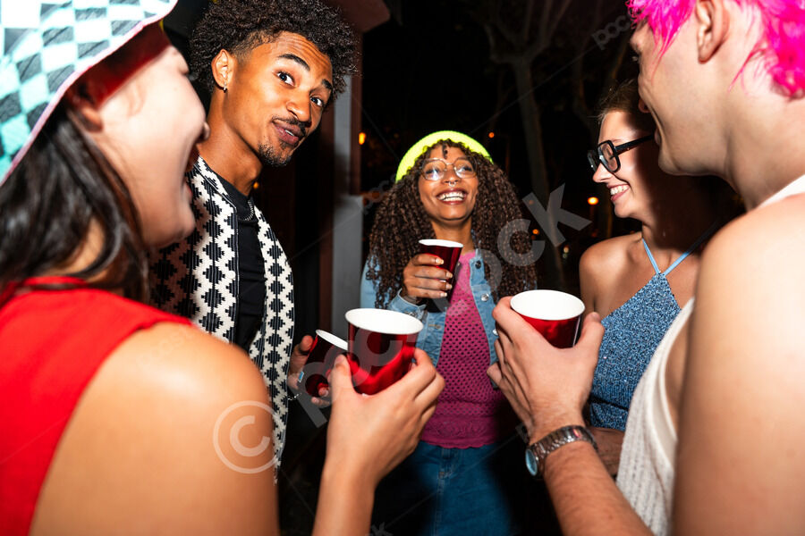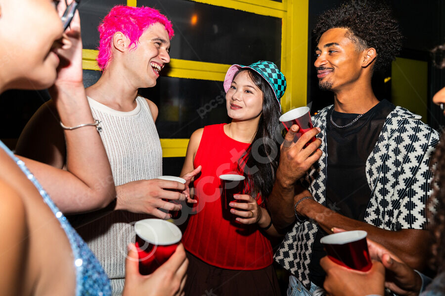 Diverse group of friends having fun holding red cups and drinking alcohol while standing together in disco club at night