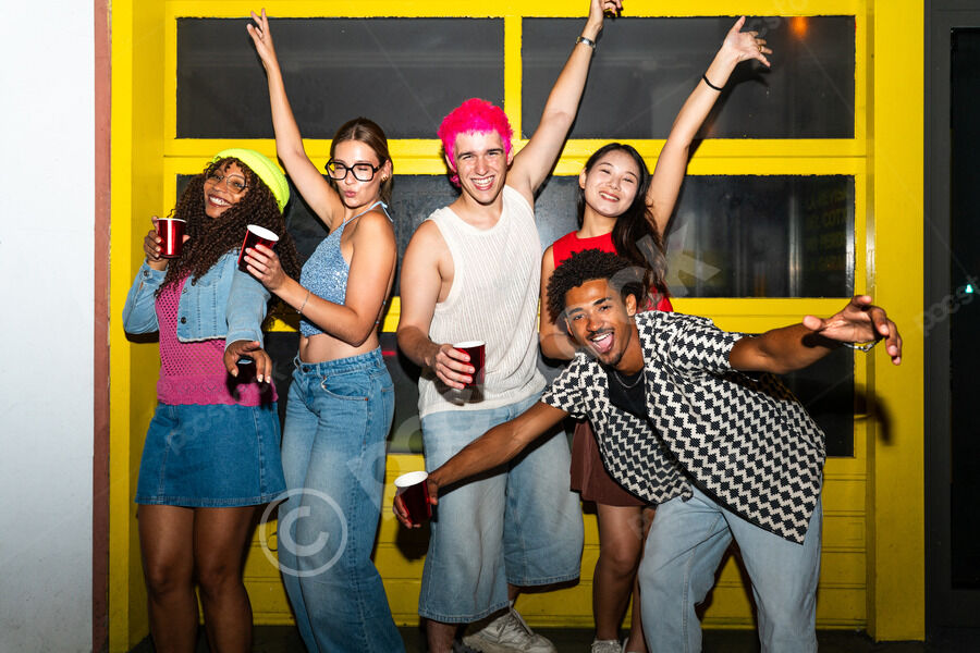 Diverse group of friends having fun raising their arms holding red cups while standing in disco club at night
