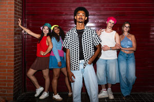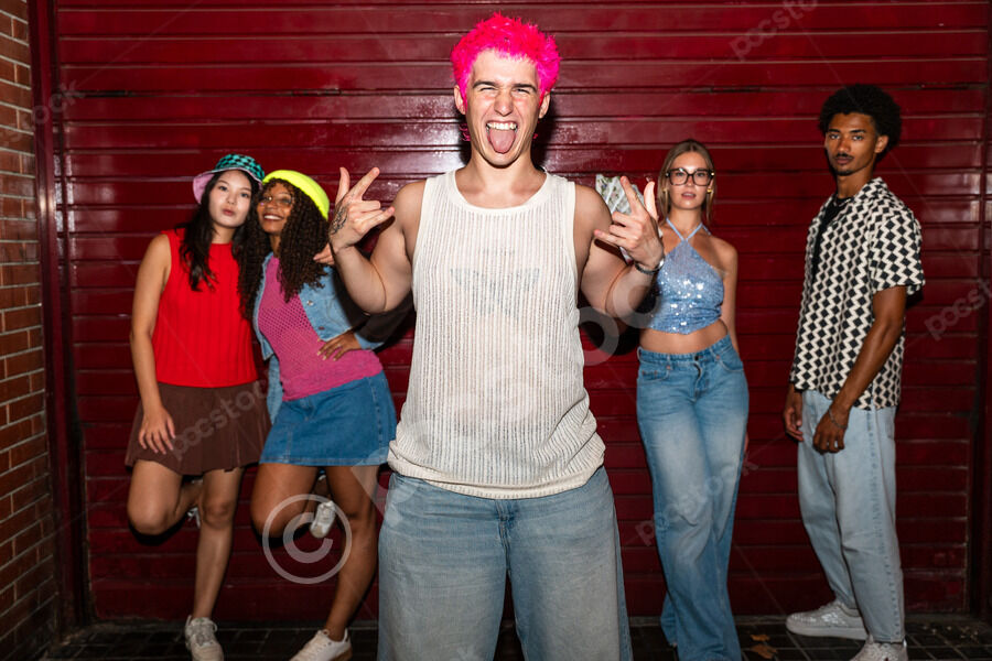 Hispanic man standing with hand in his pocket in front of his diverse friends against brown wall on street at night