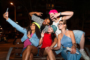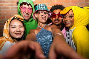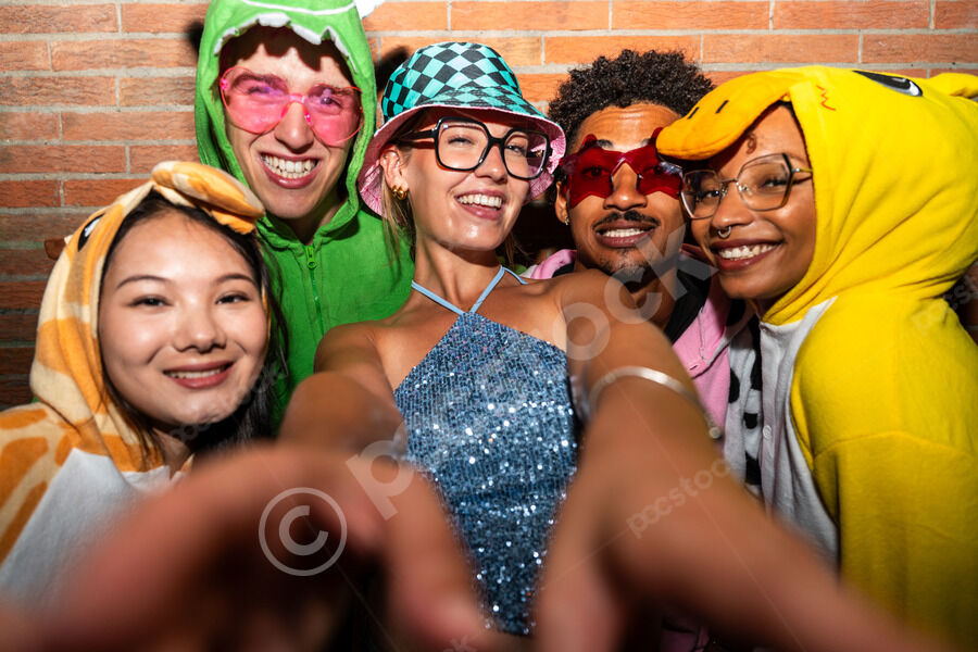 Diverse group of friends wearing onesie costumes taking selfie while standing together in front of brick wall on street at night