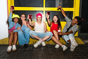 Diverse group of friends holding red cups with alcohol taking selfie on smartphone while sitting together in front of yellow window on street at night
