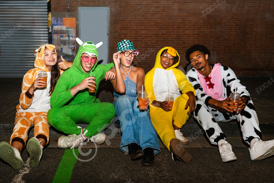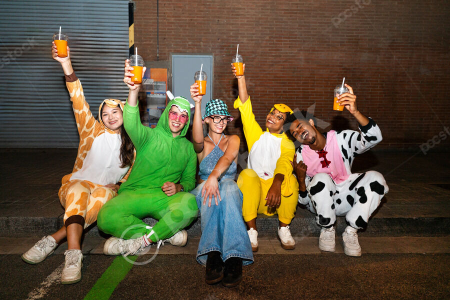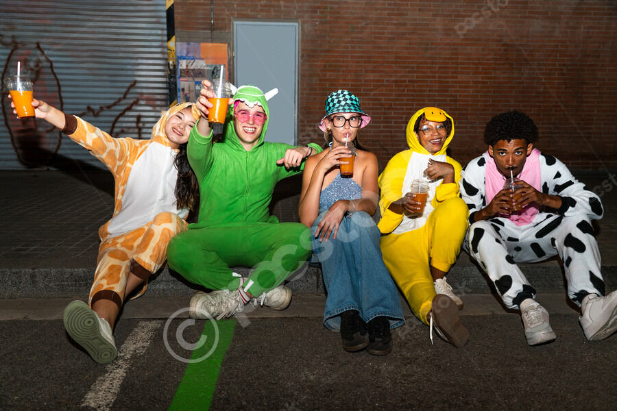 Diverse group of friends wearing onesie costumes having fun drinking juice on plastic cups while sitting together on street at night