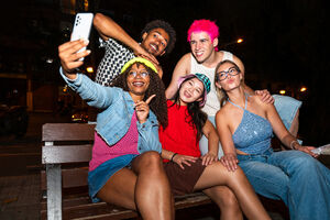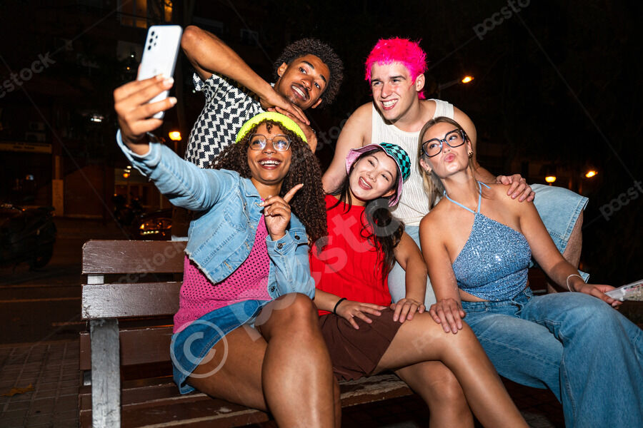 Diverse group of friends taking selfie on smartphone while sitting together on bench in park at night