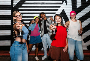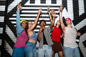 Diverse group of friends raising glasses with cocktails while standing together in front of black and white metal shutter on street at night