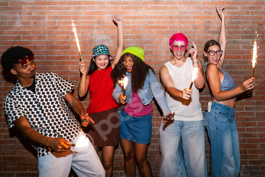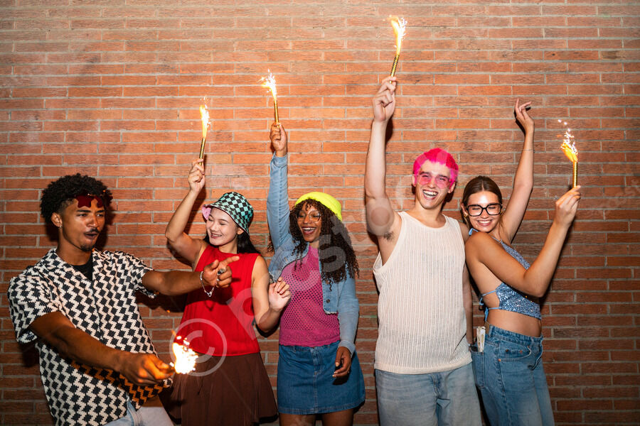 Diverse group of friends having fun holding sparklers dancing in front of brick wall in disco club at night