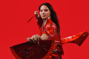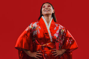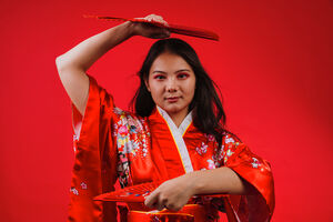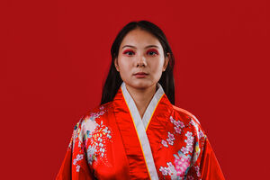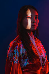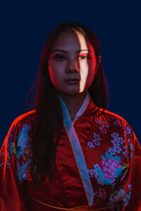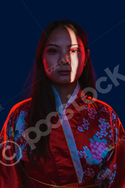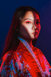 Chinese woman wearing traditional red kimono with floral patterns standing against blue background with light shining on her face in studio