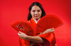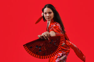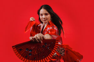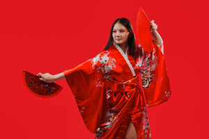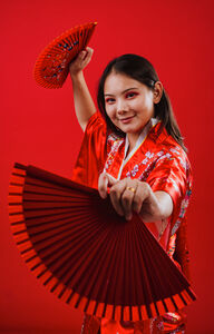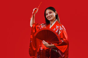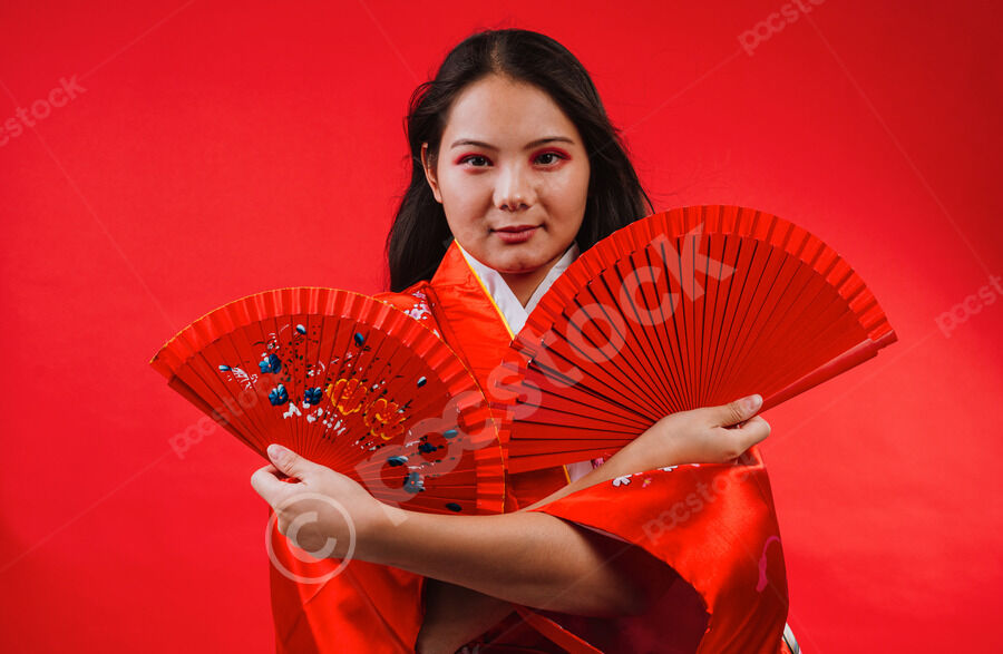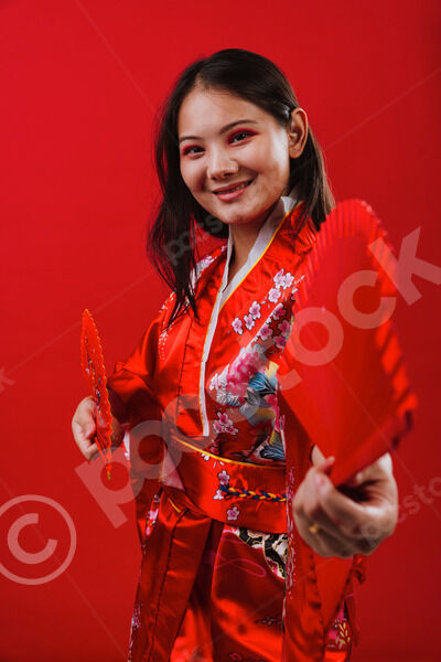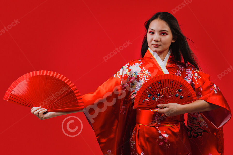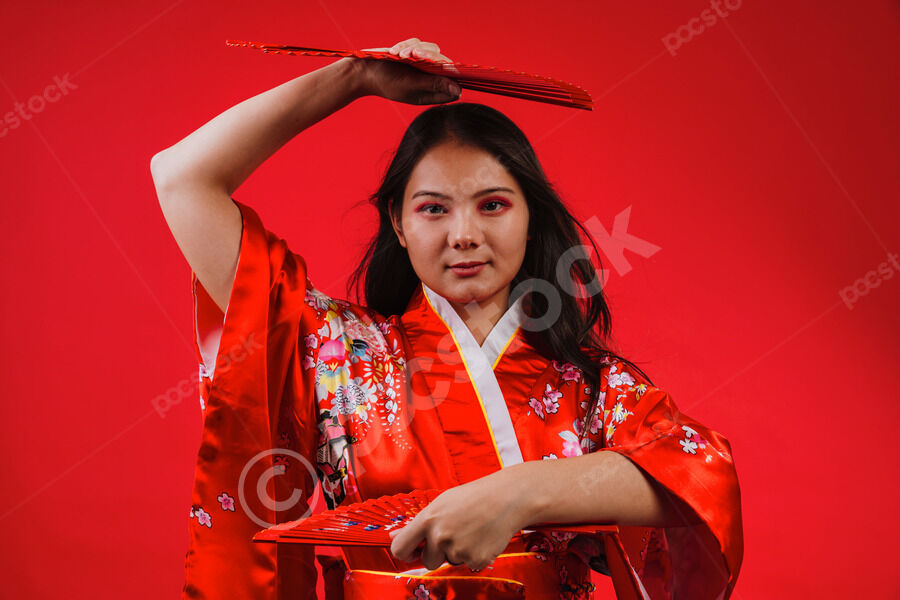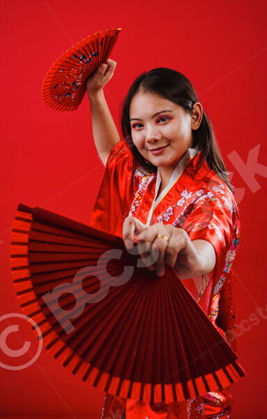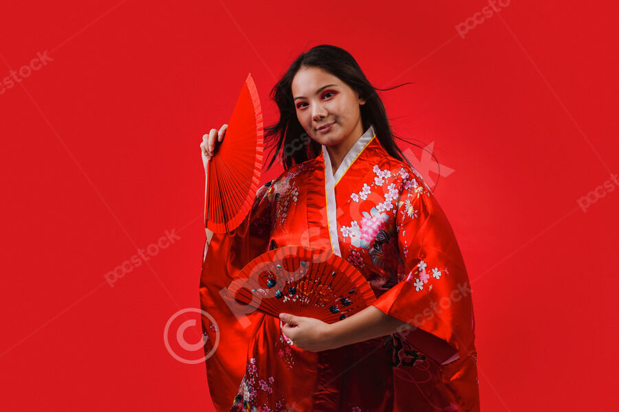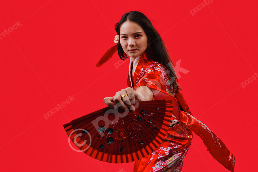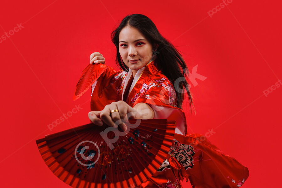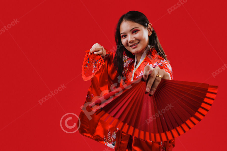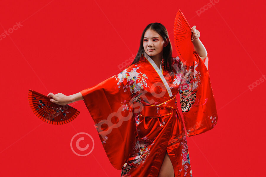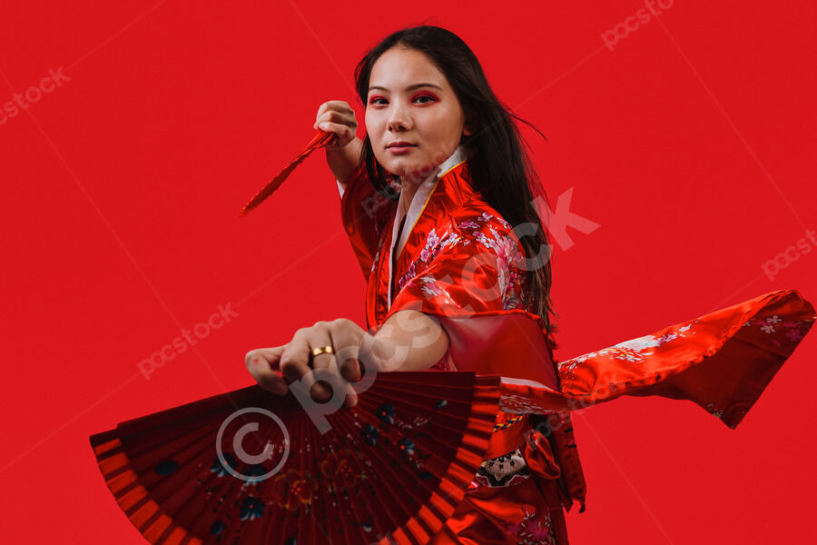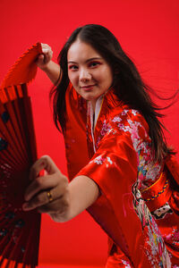 Chinese woman wearing traditional red kimono with floral patterns holding two red hand fans and smiling while dancing against red background in studio
