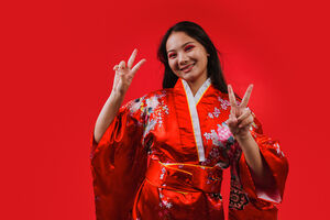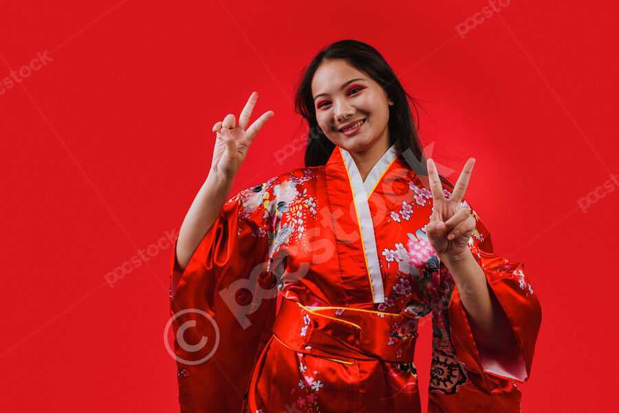Chinese woman wearing traditional red kimono with floral patterns showing peace signs and smiling while standing against red background in studio