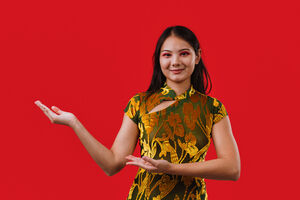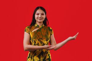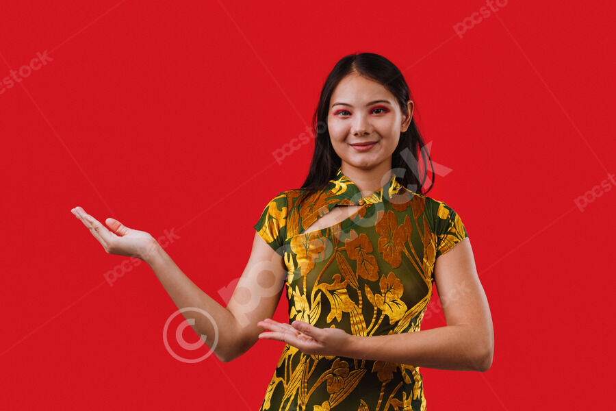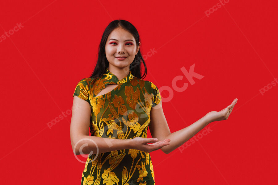 Chinese woman wearing traditional cheongsam dress extending her hands to the side presenting while standing against red background in studio