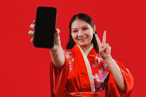 Chinese woman wearing traditional red kimono with floral patterns holding smartphone and showing peace sign while standing against red background in studio