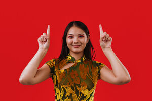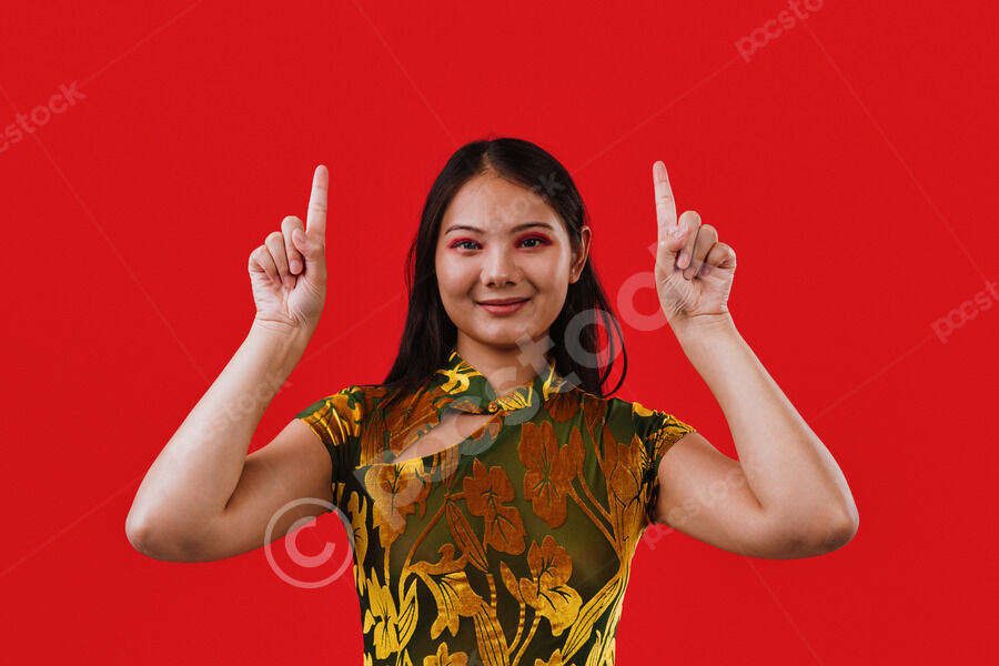 Chinese woman wearing traditional cheongsam dress pointing her fingers up and smiling while standing against red background in studio