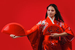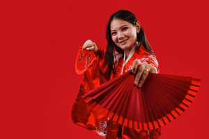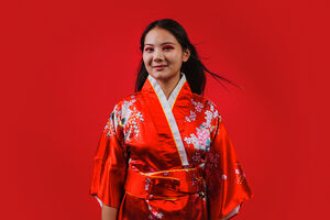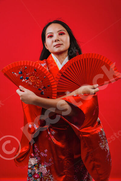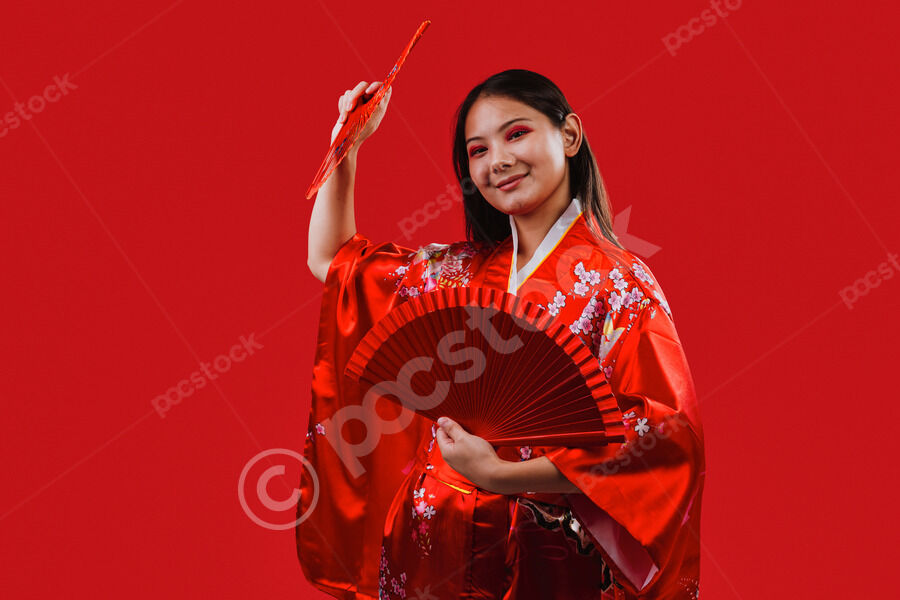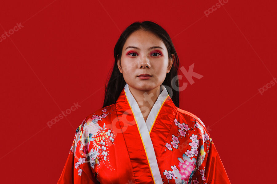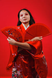 Chinese woman wearing traditional red kimono with floral patterns standing against red background in studio