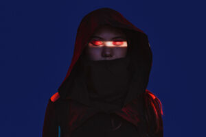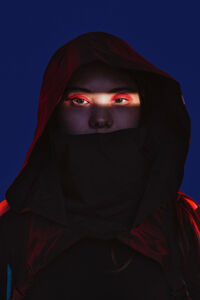 Chinese woman wearing dark hooded cloak with her mouth covered standing against blue background with light shining on her face in studio