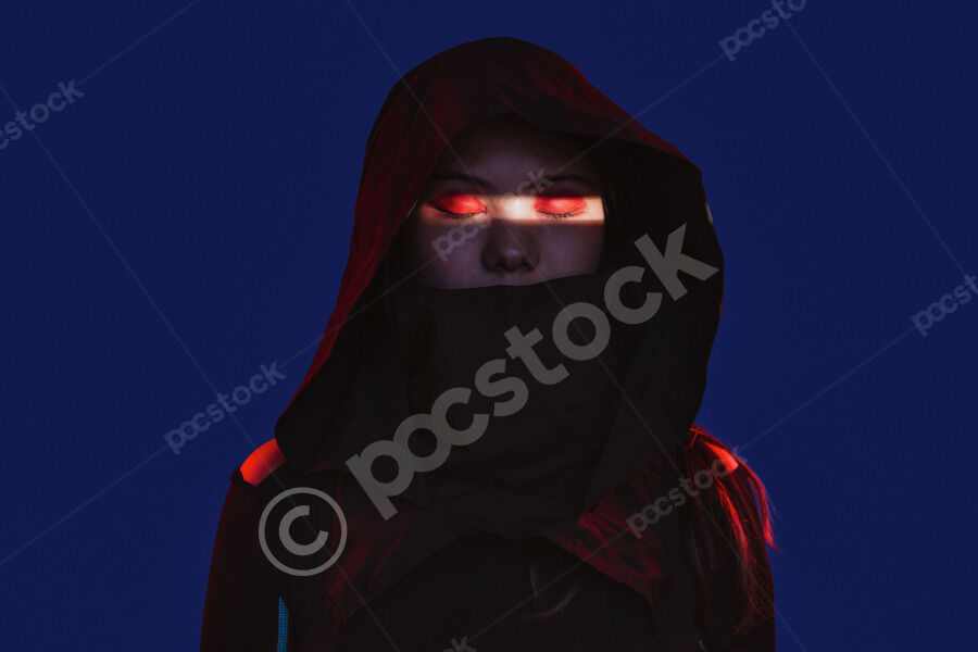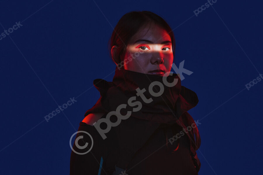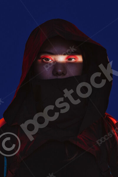 Chinese woman wearing dark hooded cloak with her mouth covered standing with closed eyes against blue background with light shining across her eyes in studio